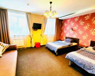 Первый этаж: В каждом номере имеется диван и одна двуспальная кровать, необходимая посуда, холодильник, плита, чайник, душ, санузел.